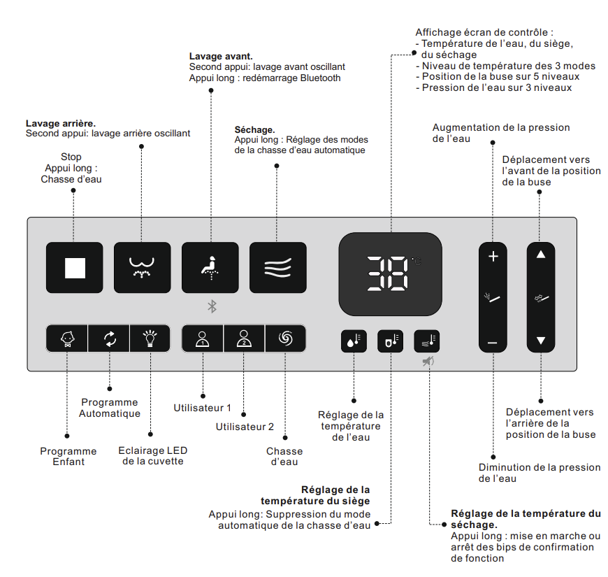 - Contrôle Bluetooth via l’application TopToilet (iOS/Android)